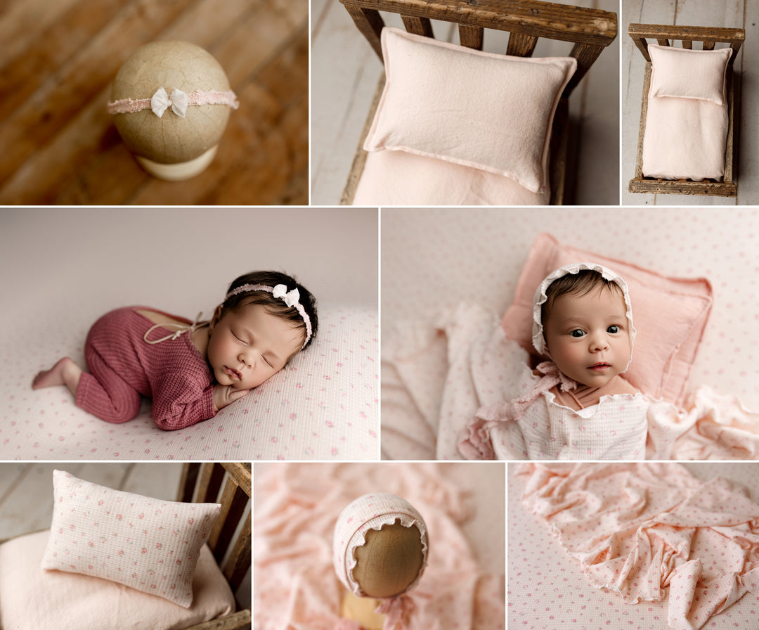 Our mattress sheet covers and pillow cases are designed specifically for newborn photography props. Each cover is made to slip easily over your posing mattresses and pillows, giving you a fresh, clean look without the need to buy multiple inserts. Crafted from soft, textured fabrics that photograph beautifully, these covers provide variety and style while keeping your studio setup efficient. With a variety of different tones and timeless patterns, they blend seamlessly with our posing fabrics, wraps, and accessories. Whether you’re layering in a crib prop, posing bed, or basket, our sheets and pillow cases give you professional styling options while protecting your prop inserts.
