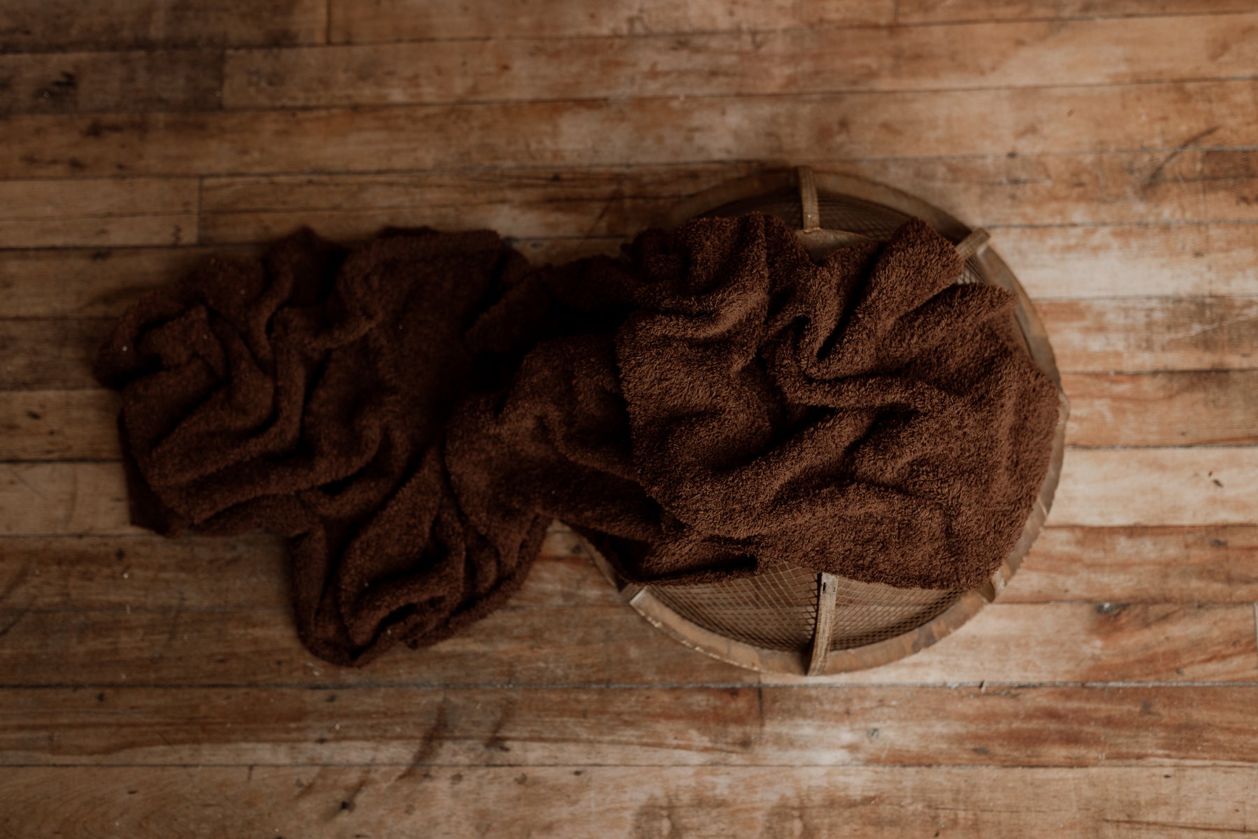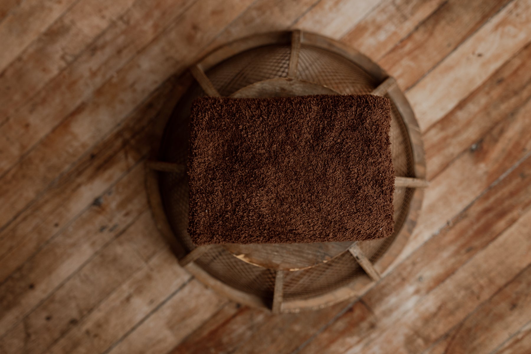 The Floof | Cocoa wrap is soft and fluffy with a slightly fuzzy texture, designed for swaddling or layering in newborn sessions. Its rich brown tone makes it a versatile piece for both neutral and styled setups.